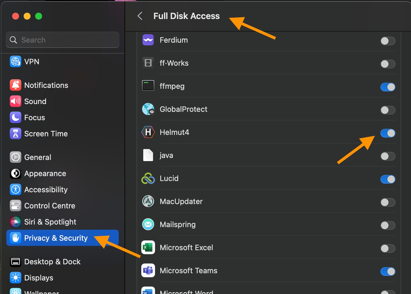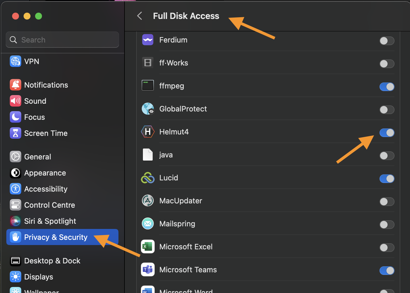 We recommend granting the Helmut4 client full disk access within the Mac OS system settings under Privacy & Security.