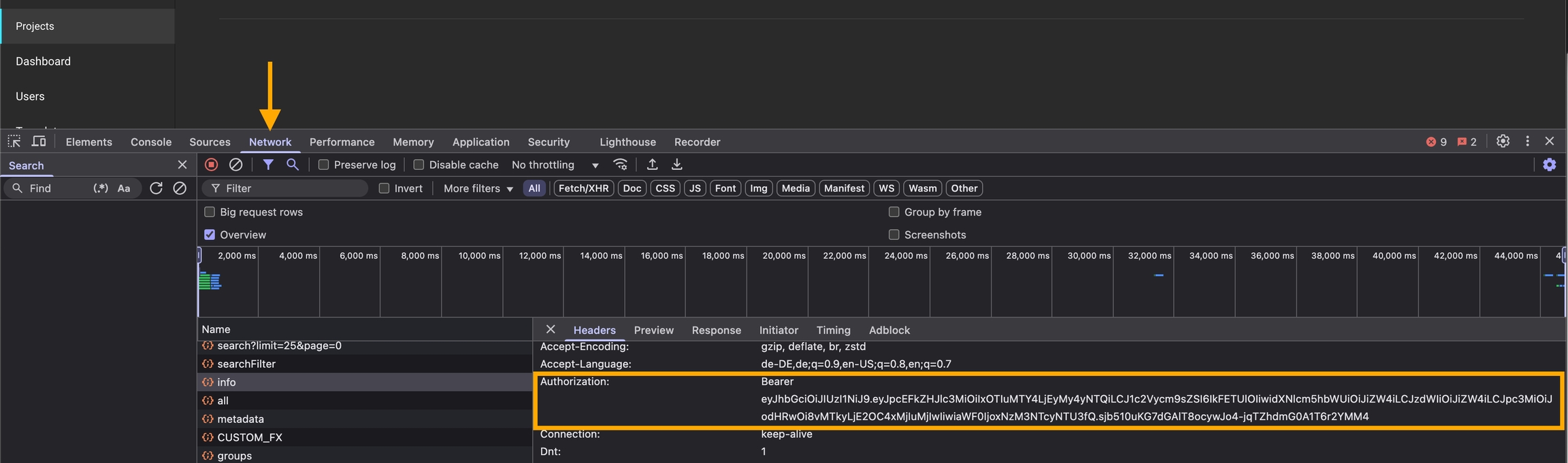 Locate the Token: Multiple network requests will be listed. Look for entries that include an Authorization header. The Bearer token will be visible as part of these requests. You can inspect these entries to copy the token.
