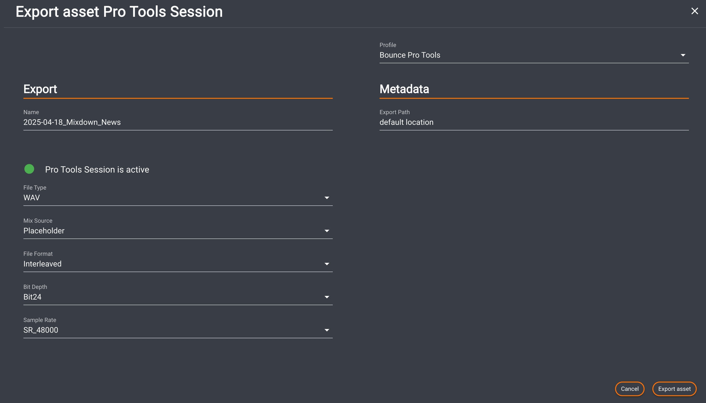 Select your desired settings, then click Export to trigger the Pro Tools Bounce Session Action node via its native API integration.