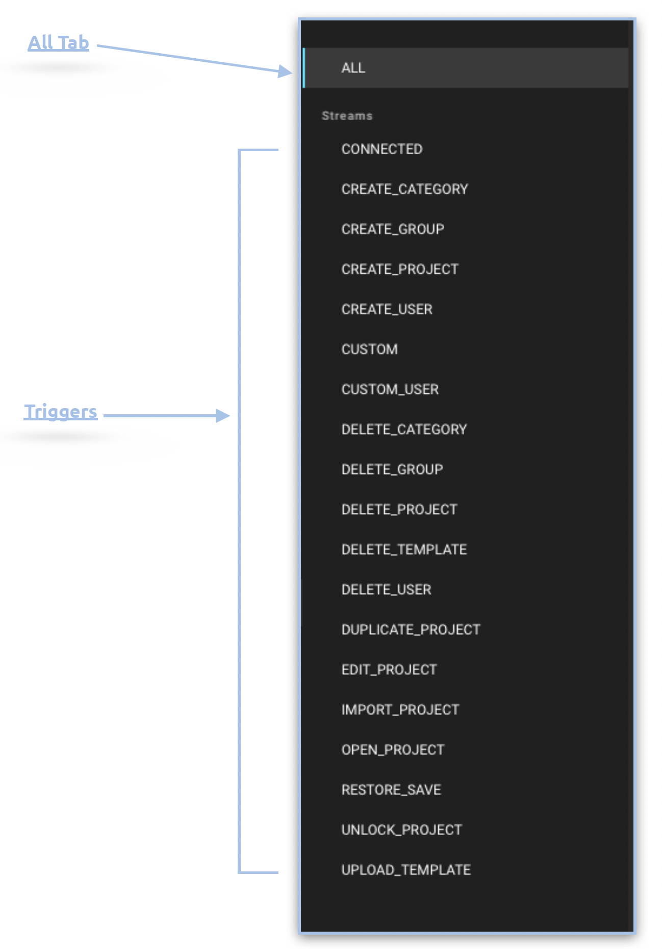 This view shows all trigger-related streams, including their names, host types, modification and creation dates, as well as the status of any stream(s).