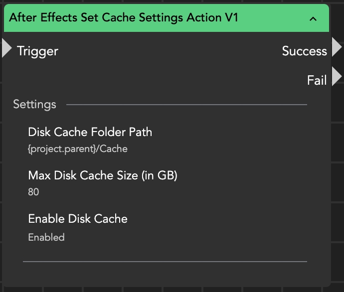 The After Effects Set Cache Settings Action node configures disk cache parameters for After Effects. You can set the cache folder, define the maximum disk cache size (in gigabytes), and enable or disable the disk cache functionality globally.