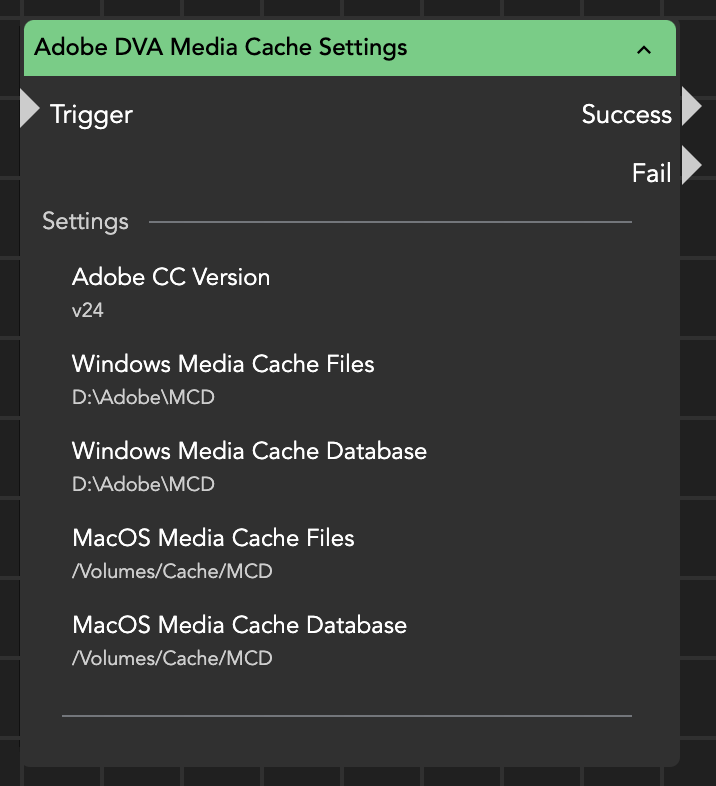 The DVA (Digital Video Application) Media Cache node allows you to configure cache folders for both the Media Cache and Media Cache Database. This setting applies to Premiere Pro, After Effects, Audition, and Media Composer.