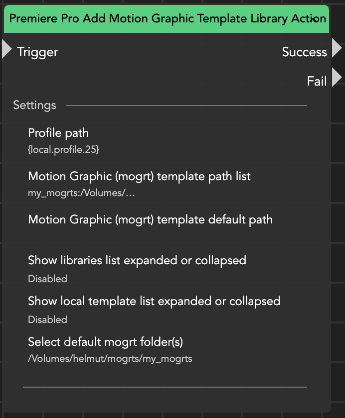 The Premiere Pro Add Motion Graphic Template Library Action node enables the addition of Motion Graphic folders to Premiere Pro’s “Graphic Template” panel.