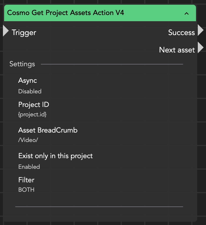 Whenever the context between a project and its referenced assets is needed, the versatile Cosmo Get Project Assets Action node is available to provide the required information.