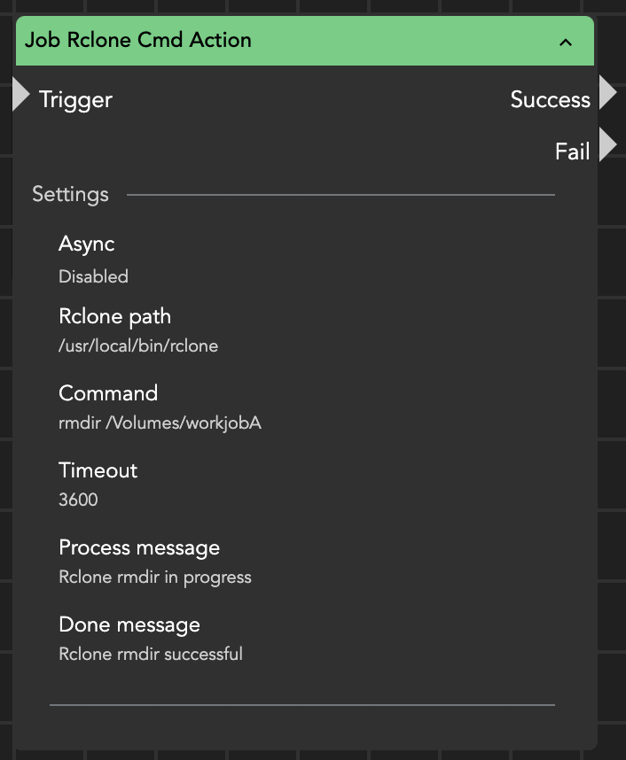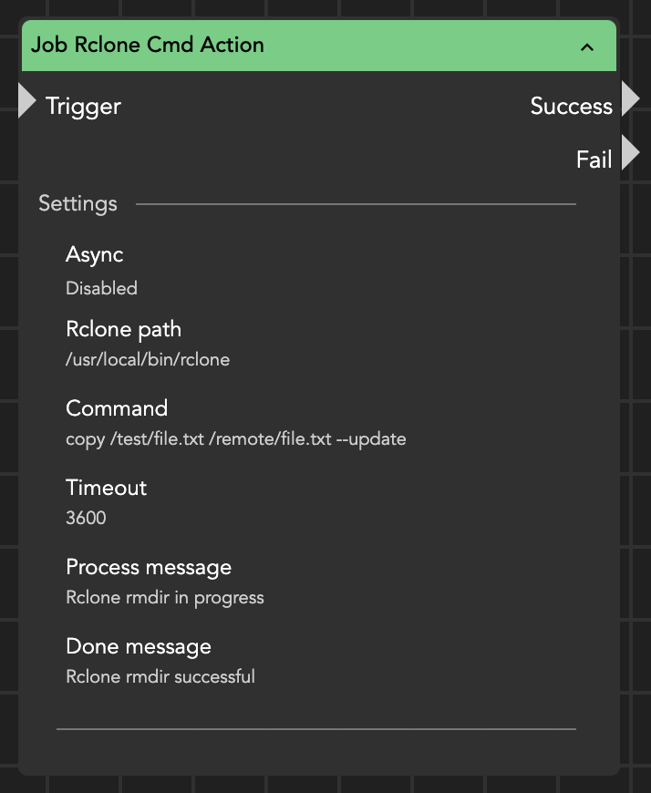 With the help of the job RClone Cmd Action it is possible to run any rclone command against an assets or folders. In order for this to be possible, RCLone must be installed on the workstation on which this node (within a stream) is running. The path to the binary is given in the node, but can also be freely defined.