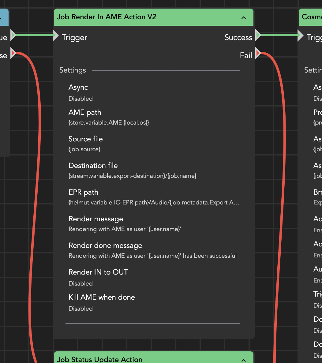 Using the Job Render in AME Action, it is possible to render a file or sequence/composition using a defined encoding preset (epr) in Adobe Media Encoder. This is equally possible for imports and exports and can be run on either a Mac or Windows client (a licensed Media Encoder instance is required here). Media Encoder returns the progress of the encoding process to Helmut, which is displayed in the dashboard when the node is used as part of a workflow that creates a job object. This is always the case when the Helmut4 panel (Autoimport, Export, Web.Export, ...) is involved or a watch folder monitored by the server.