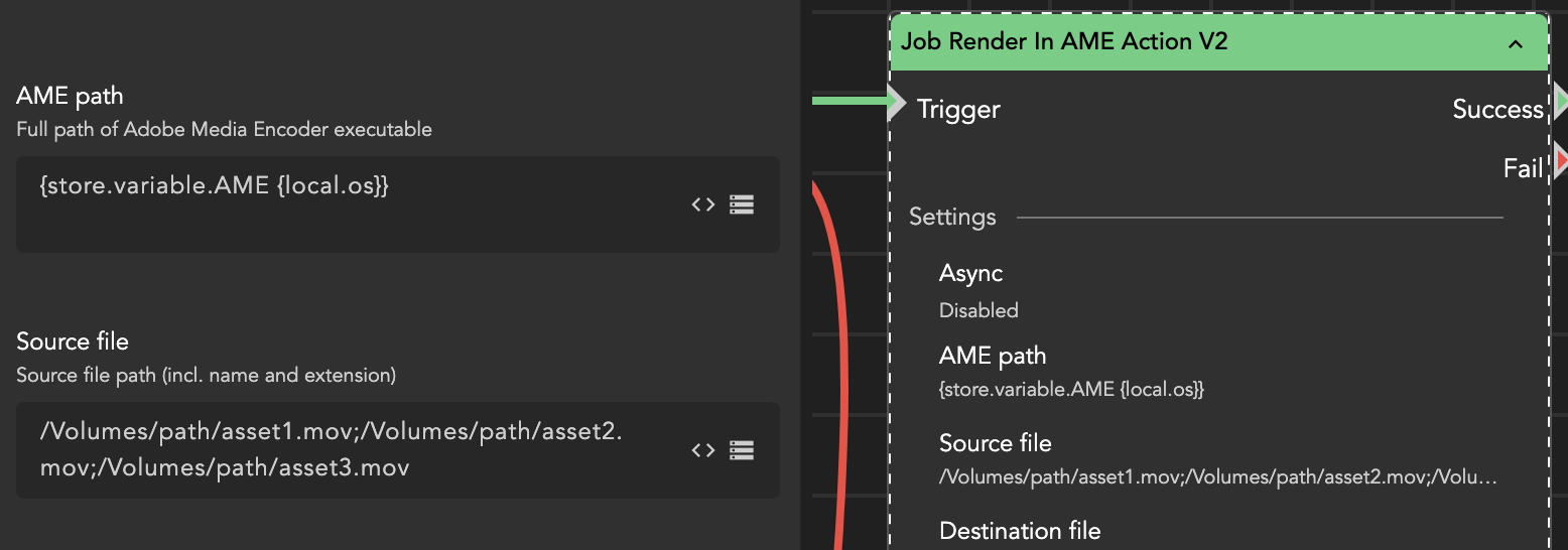 The node does not need any information about the file extension of the target format in the source path, as this is defined by AME itself (it is defined in the .epr file). If desired, AME also counts whether the file already exists in the destination path. (setting in AME). The node sets the placeholder {job.destination} in the payload job, which contains the destination path of the file defined in the node including the file extension in the further course of the stream.