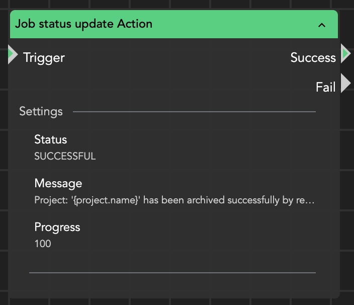 The Job Status Update Action node can be used to set a job's status to values such as running, failed, successful, or queued. This status update is visible on the website dashboard as well as within the Helmut4 panel, ensuring that the current job status is accurately reflected at all times. This is particularly useful when an action node is executed that does not independently change its status.