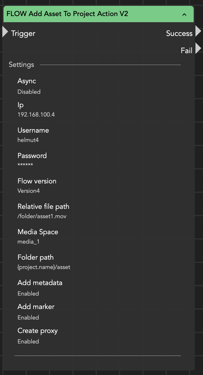 The Flow Add Asset To Project Action node can add and check in new assets to an existing Flow project, making them available for further workflows.