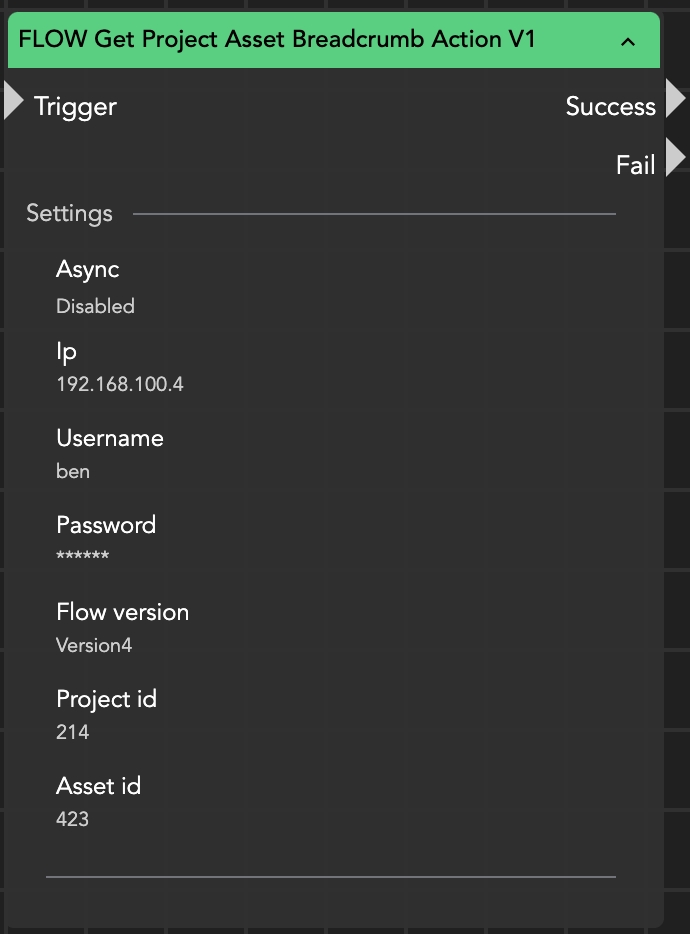 The Flow Get Project Asset Breadcrumb Action node retrieves an asset's breadcrumb trail within a Flow project. The breadcrumb is returned as a JSON array string, where each element follows the folderName_folderId format.