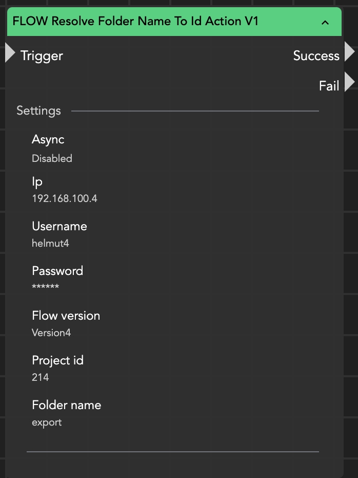 The Flow Resolve Folder Name To Id Action node performs a "contains" search across all folders in a project based on their names. It returns the results as a JSON array string, with each element formatted as folderName_folderId.