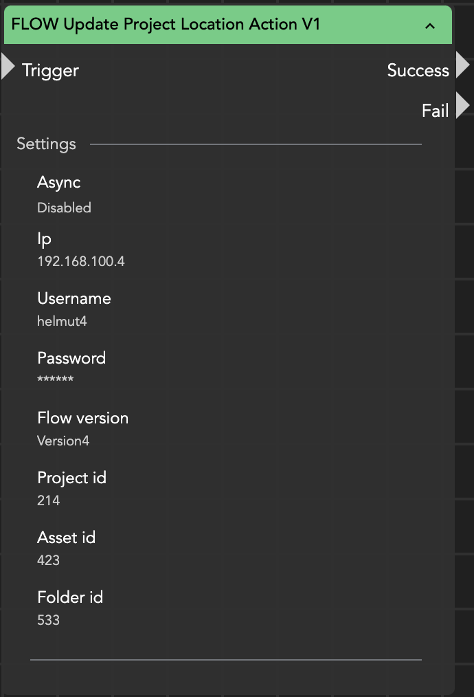 The Flow Update Project Location Action node moves an asset from one folder to another within a Flow project. The node does not return any result.