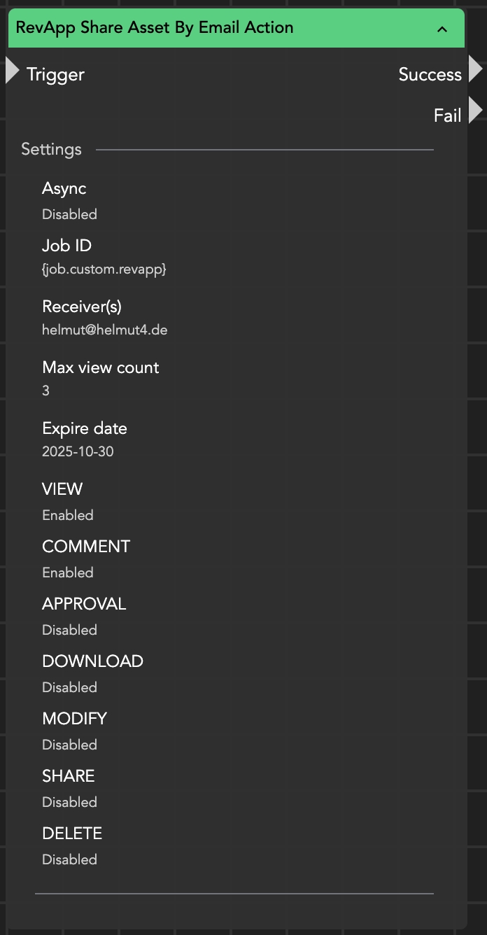 The RevApp Share Asset By Email Action node lets you share a previously uploaded asset with recipients via their email addresses.