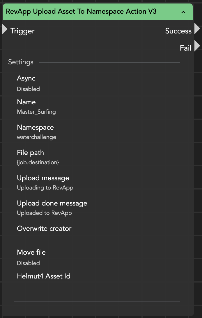 The RevApp Upload Asset to Namespace Action node can copy or move an asset to a specified namespace in RevApp by providing a file path.