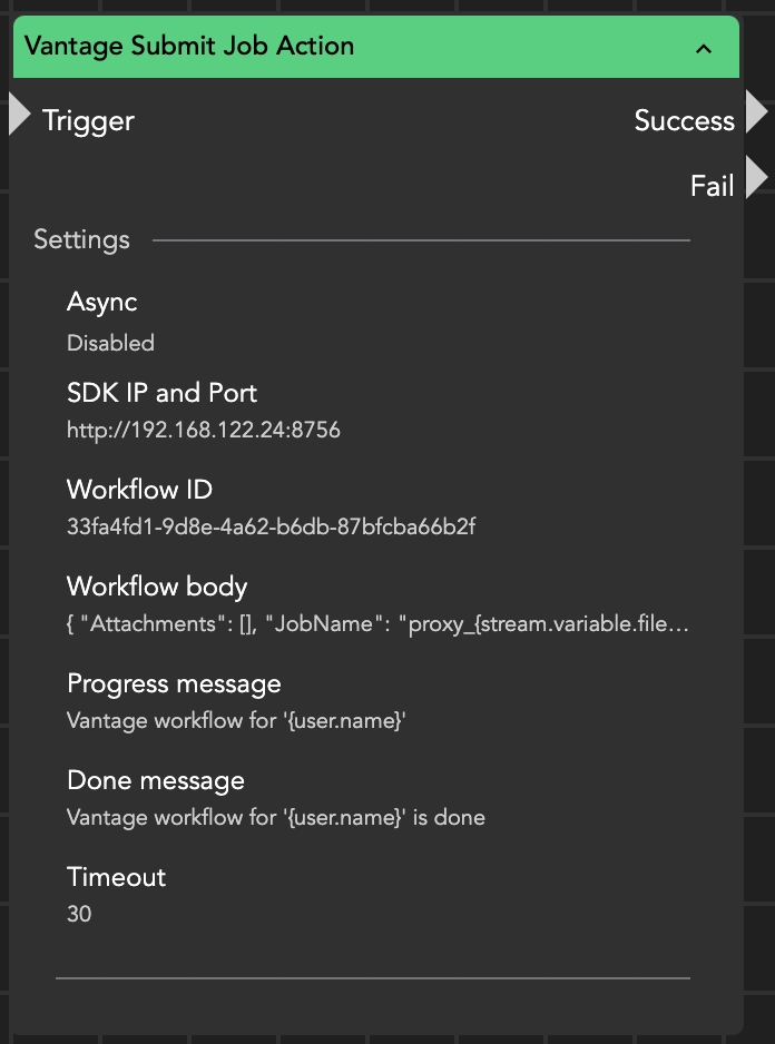 This node serves the purpose of transmitting a JSON payload to a Vantage system, consequently initiating a new job within the system and delivering real-time updates on the job dashboard.