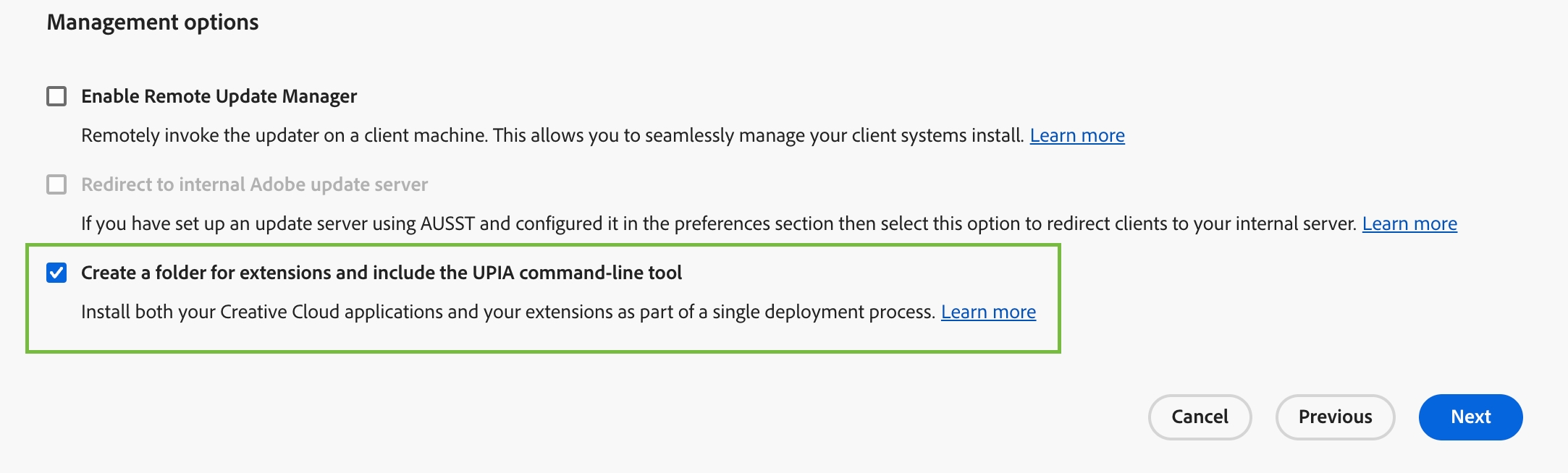 If you are using an FRL Online, Offline, or any other Adobe application package created via the Adobe Admin Console you might not be able to perform the following action if the package is missing the option "Create a folder for extensions and include the UPIA command-line tool" in the management options section.