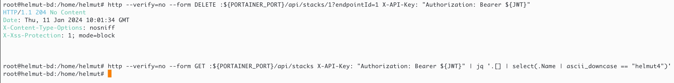 http --verify=no --form DELETE :${PORTAINER_PORT}/api/stacks/1?endpointId=1 X-API-Key: "Authorization: Bearer ${JWT}"You can confirm the success of the command by reattempting to list the "helmut4" stack. If the command was successful, you should not see any output in the terminal.
