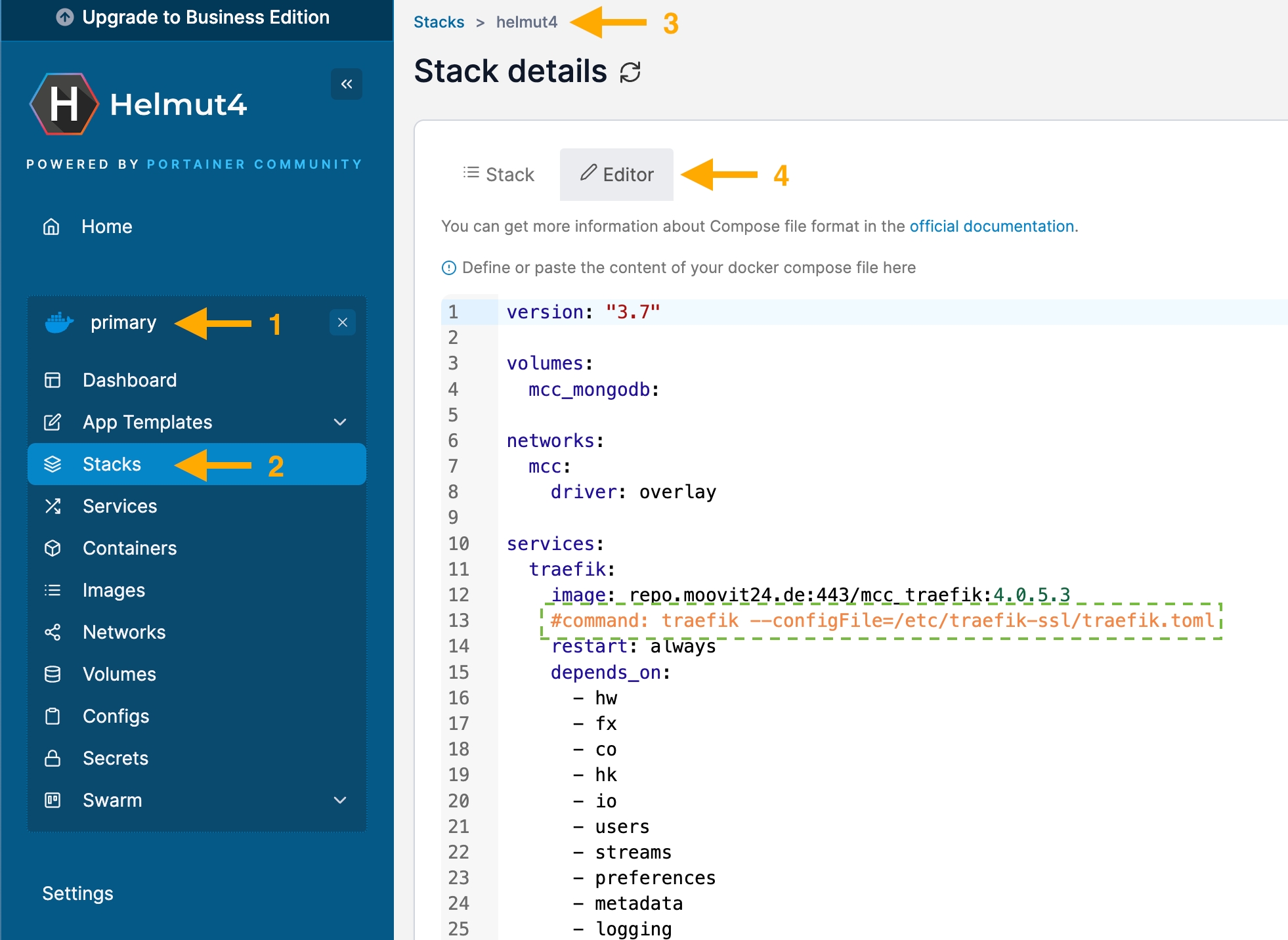 Navigate to the helmut4 stack via primary (1) -> stacks (2) -> helmut4 (3) -> editor (4)