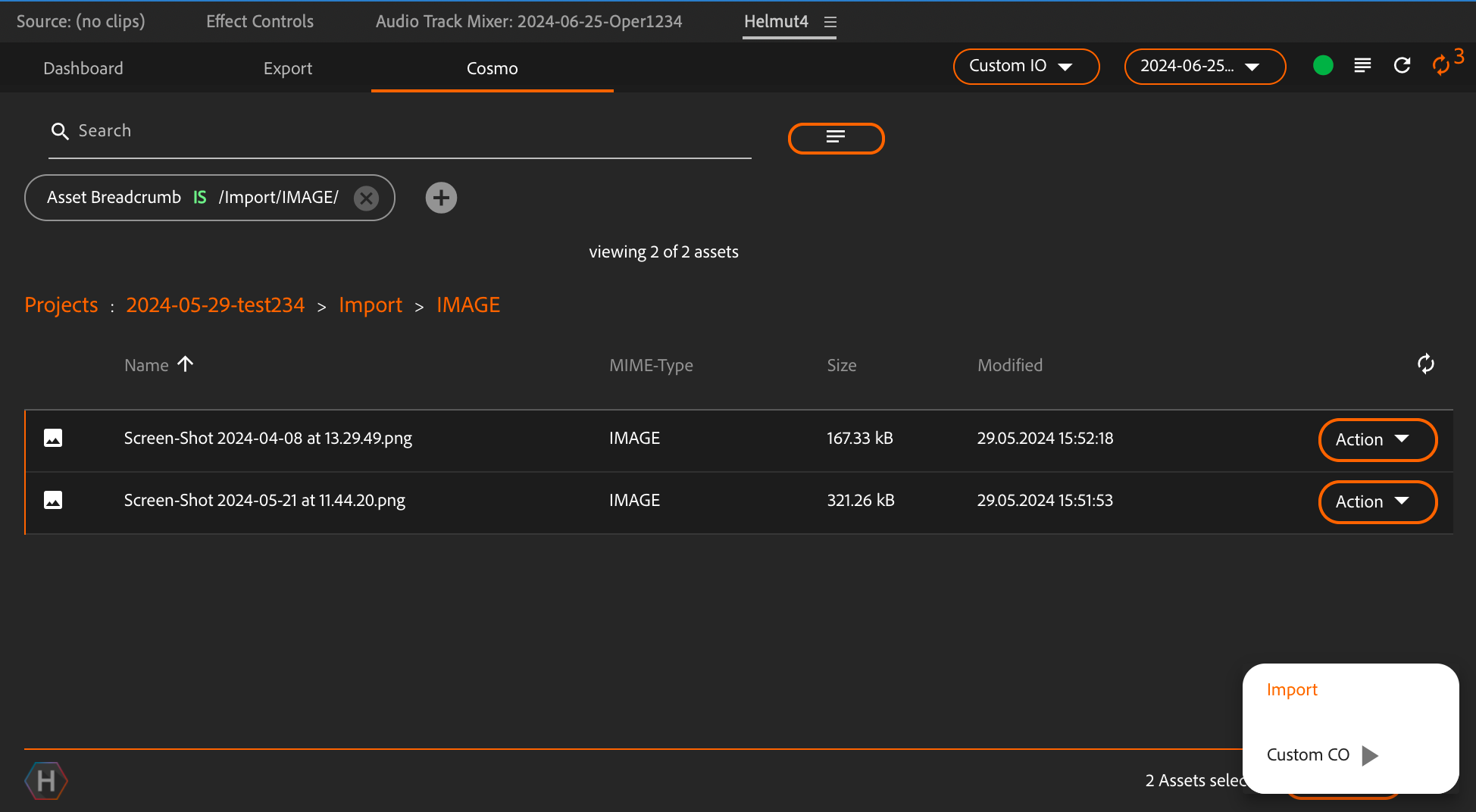 If a single asset is needed, the user can import it via the 'Import' button. This prevents the need to start an autoimport profile; the asset will simply be linked into the current project, and the Cosmo database will recognize that this specific asset is now used in another project (unique status).