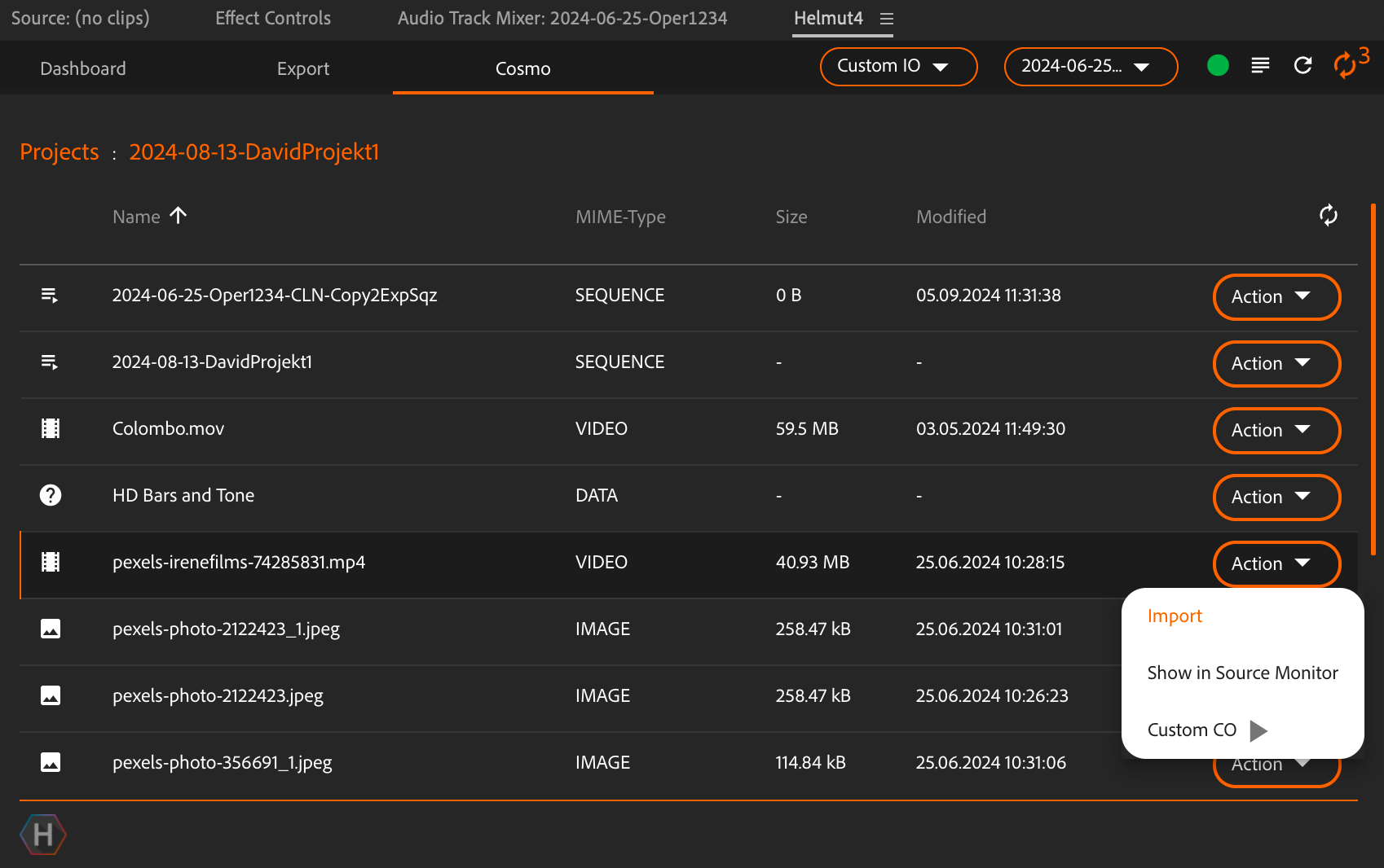 The Cosmo panel offers some very useful functionality. It is possible to browse and look into other projects (depending on your group permissions). This can facilitate collaboration, as one can preview an asset in the Adobe Source Monitor.