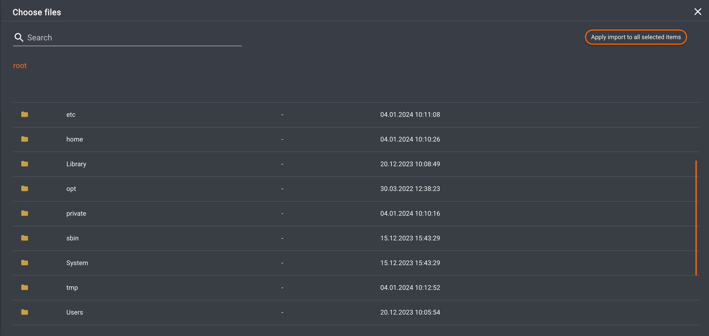 Select the assets to be ingested; the chosen assets will be marked with an orange circle containing a tick. After completing the selection, click the 'Apply import to all selected items' button. The system will remember the last directory used for the next opening.