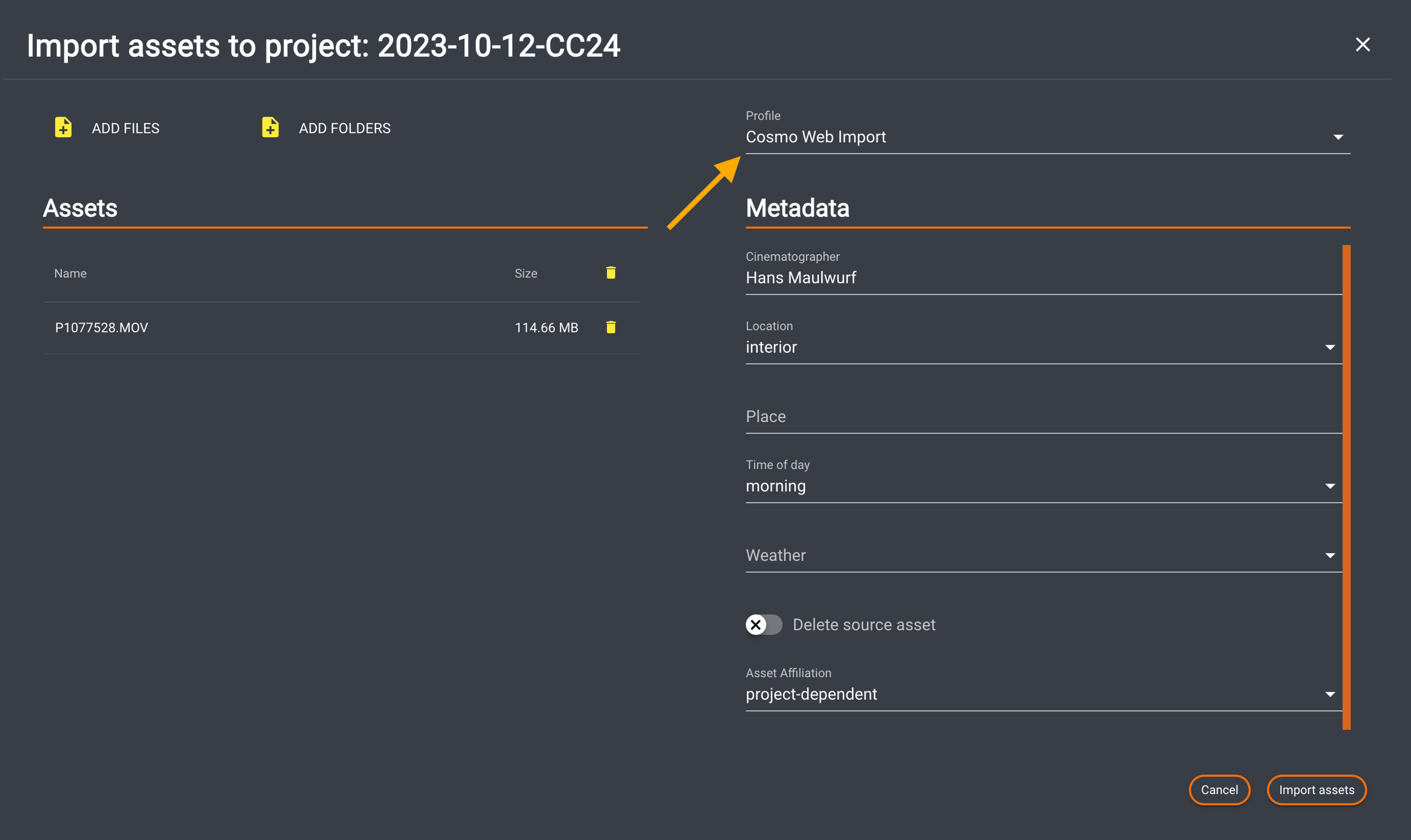 After clicking the 'Import Asset' button, an overlay opens. Please select the dedicated profile for processing. As profiles may use different metadata sets, the metadata section may change.