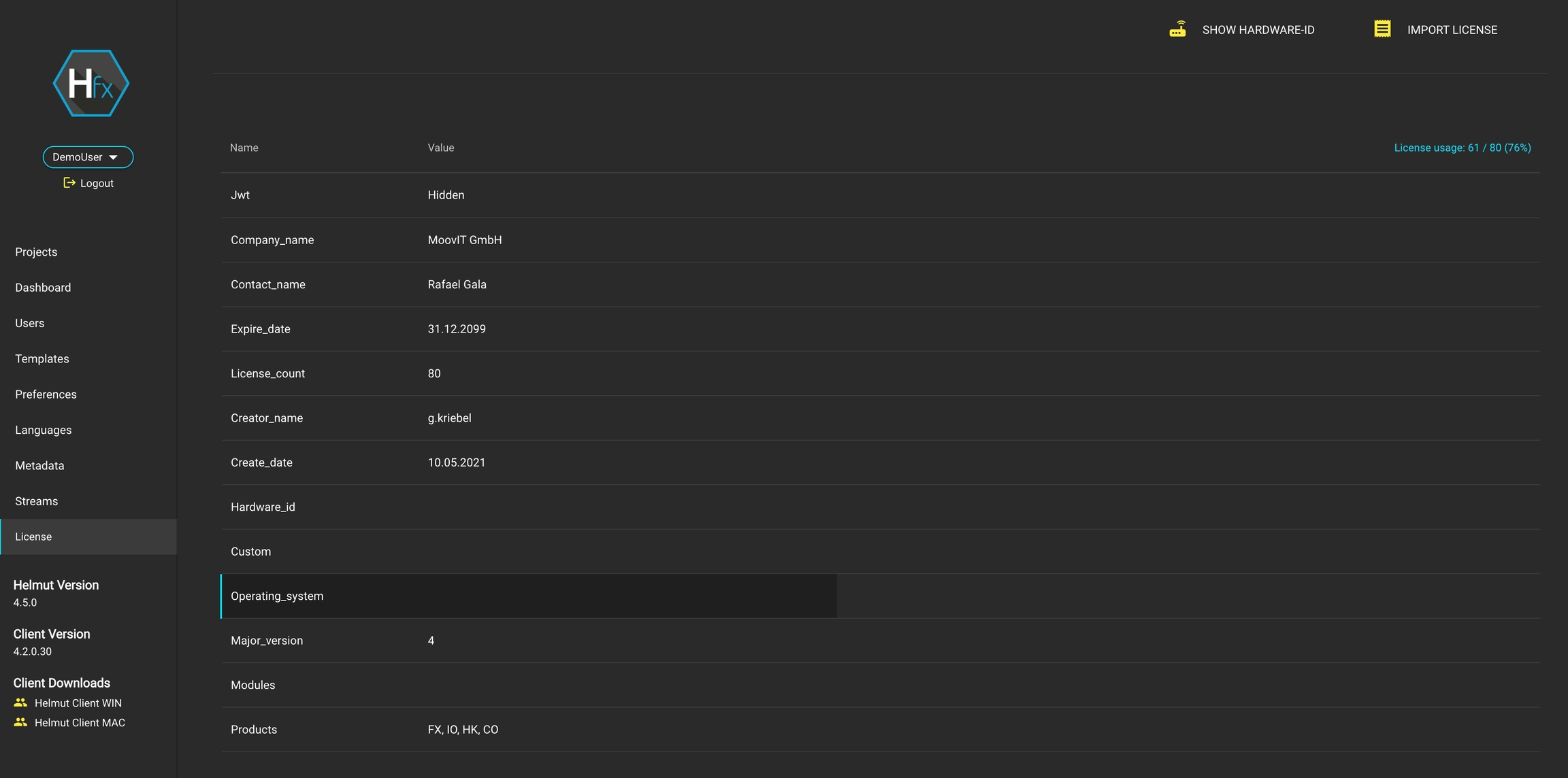 This button will display the Hardware ID of the Helmut4 host, which is necessary for creating the license. This is particularly important for any staging, POC, and demo environments.