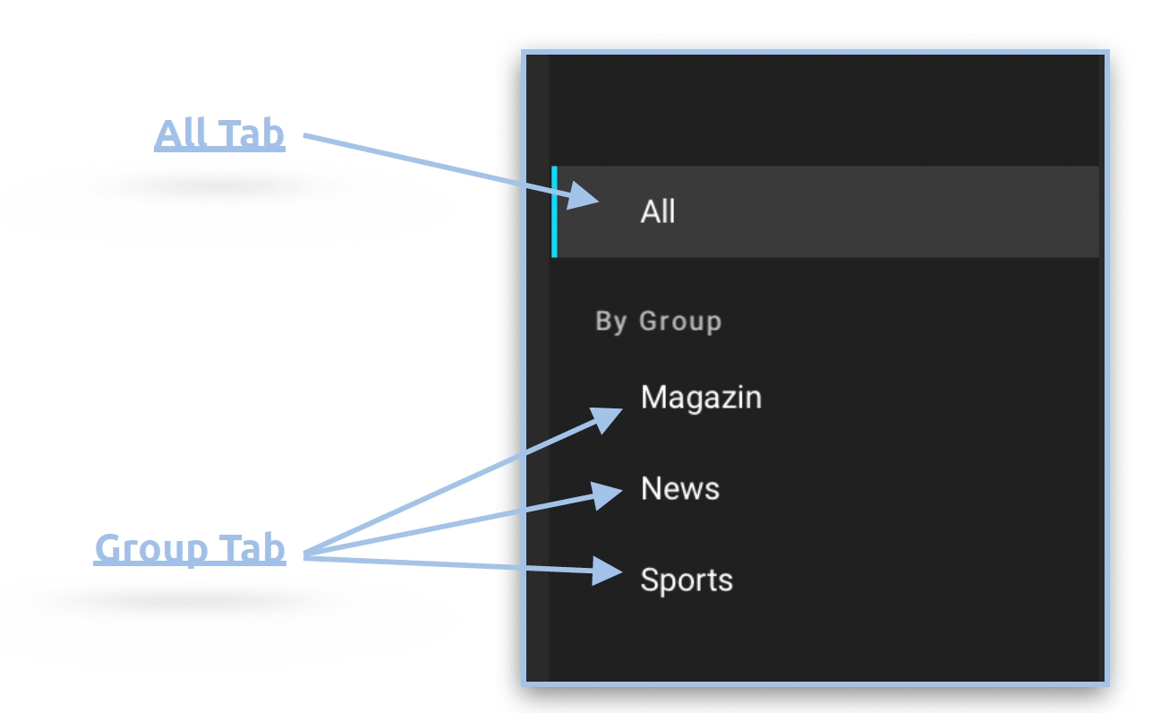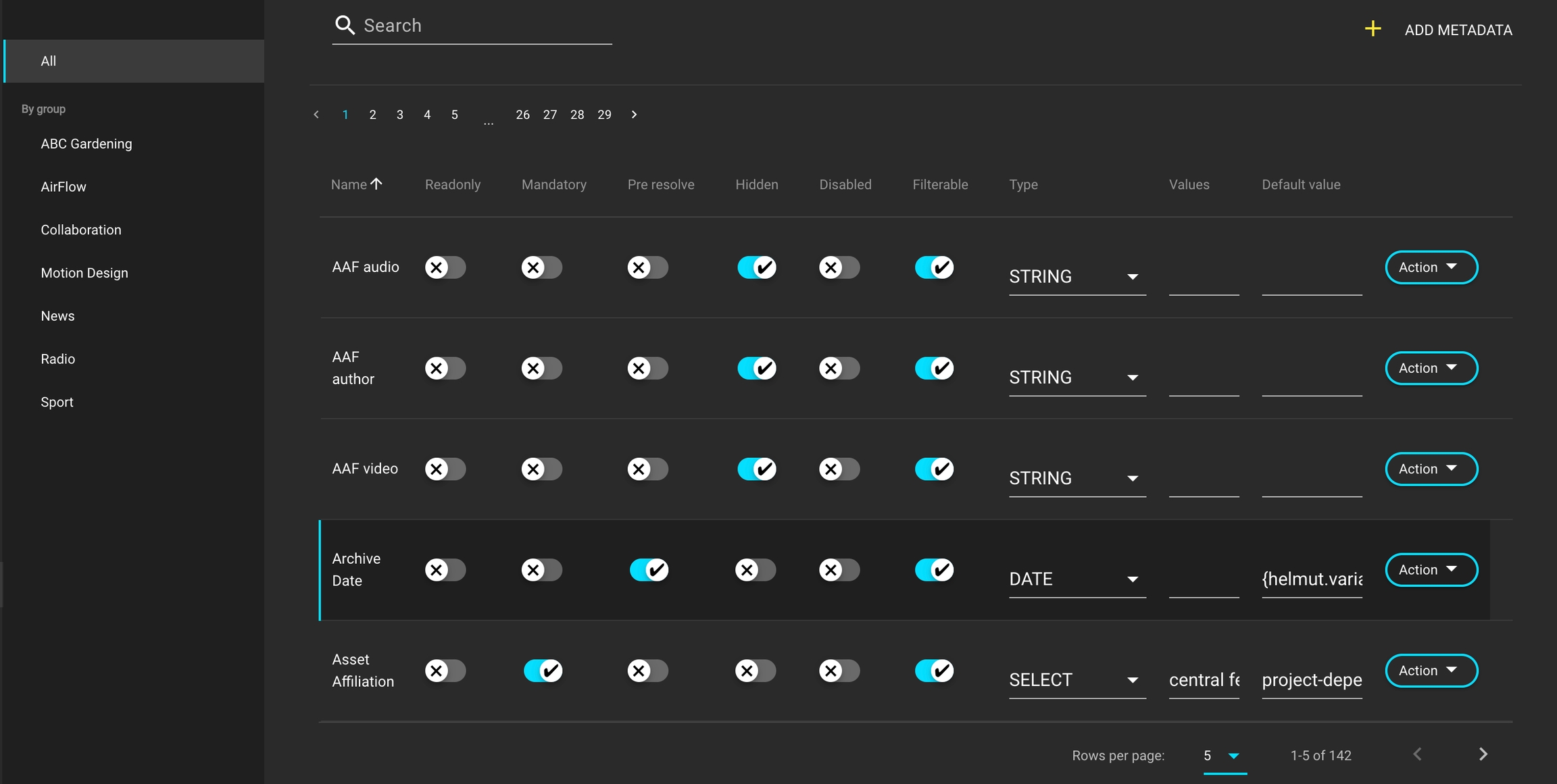 Displays all metadata created in the system and filters the metadata entries displayed in the list view when selecting a group.