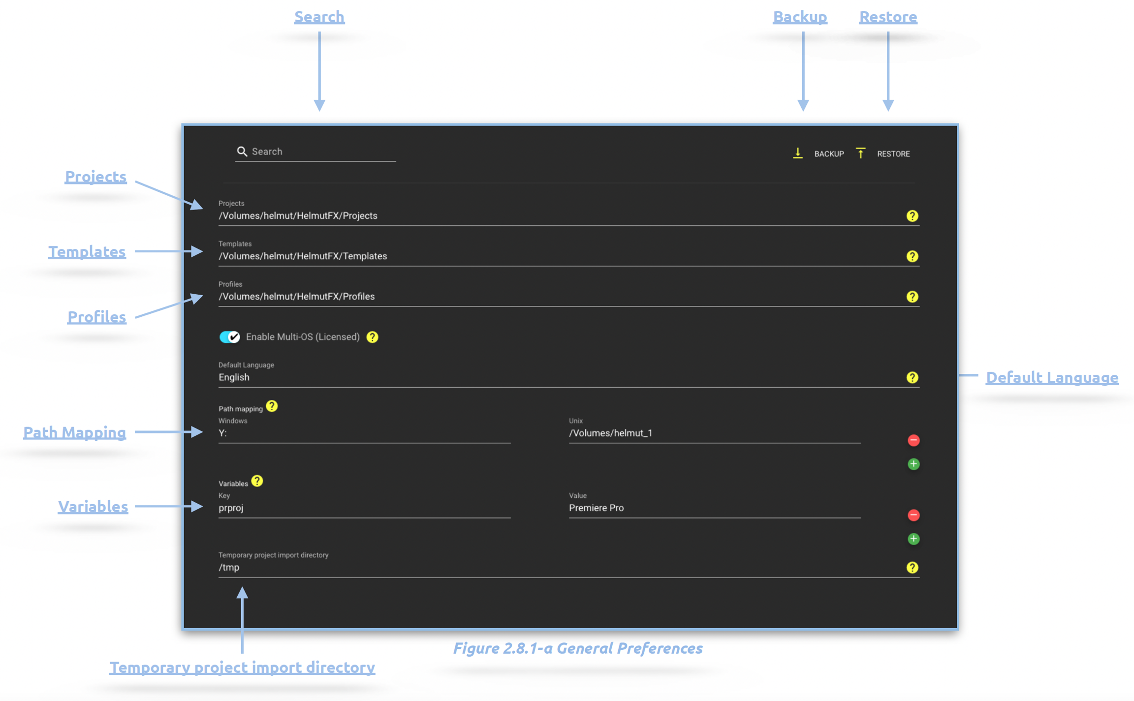 Within the preferences, numerous tools, such as backup and restore functionalities, along with Helmut Variables, can be accessed. Additionally, the crucial component is the path mappings, which facilitate the conversion of paths between Windows (UNC) and Unix (Macintosh, Linux) systems.