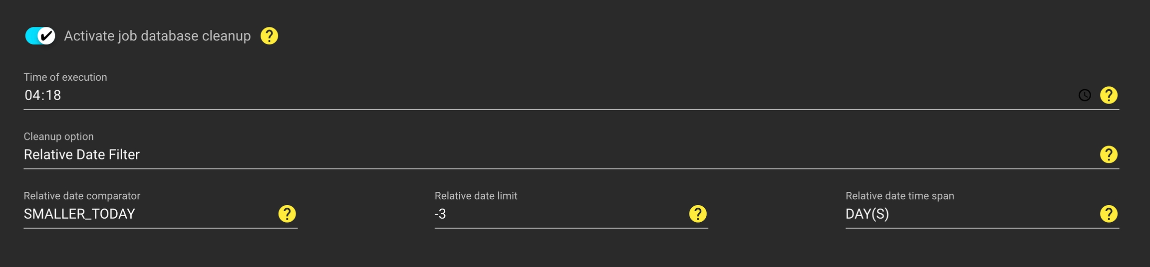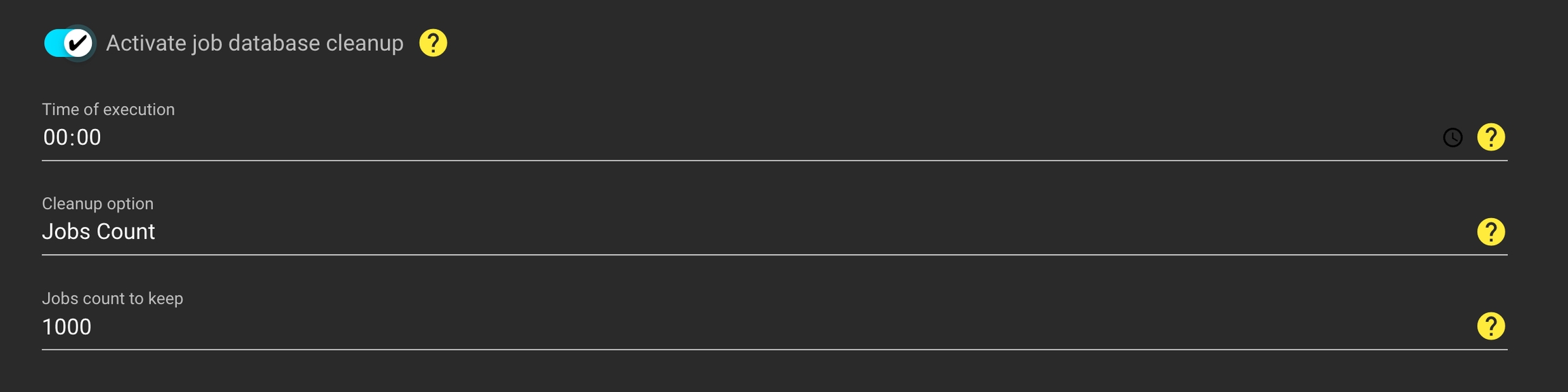 Example: If you enter the number 1000 in the "Jobs count to keep" field, only the last 1000 tasks will be saved in the dashboard/database. Everything else will be removed after the task is completed.
