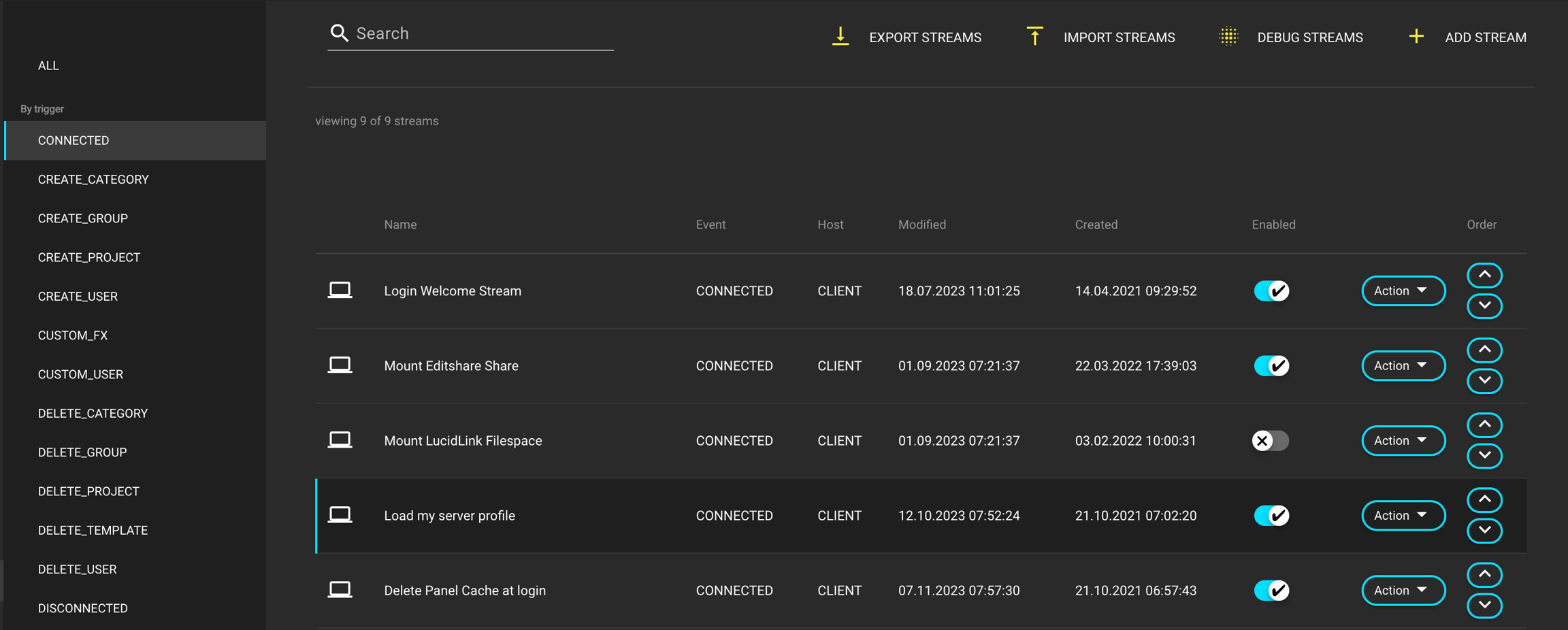 Within Helmut4, streams are workflows that are linked to a trigger event. These triggers are displayed under the menu item in the side menu.