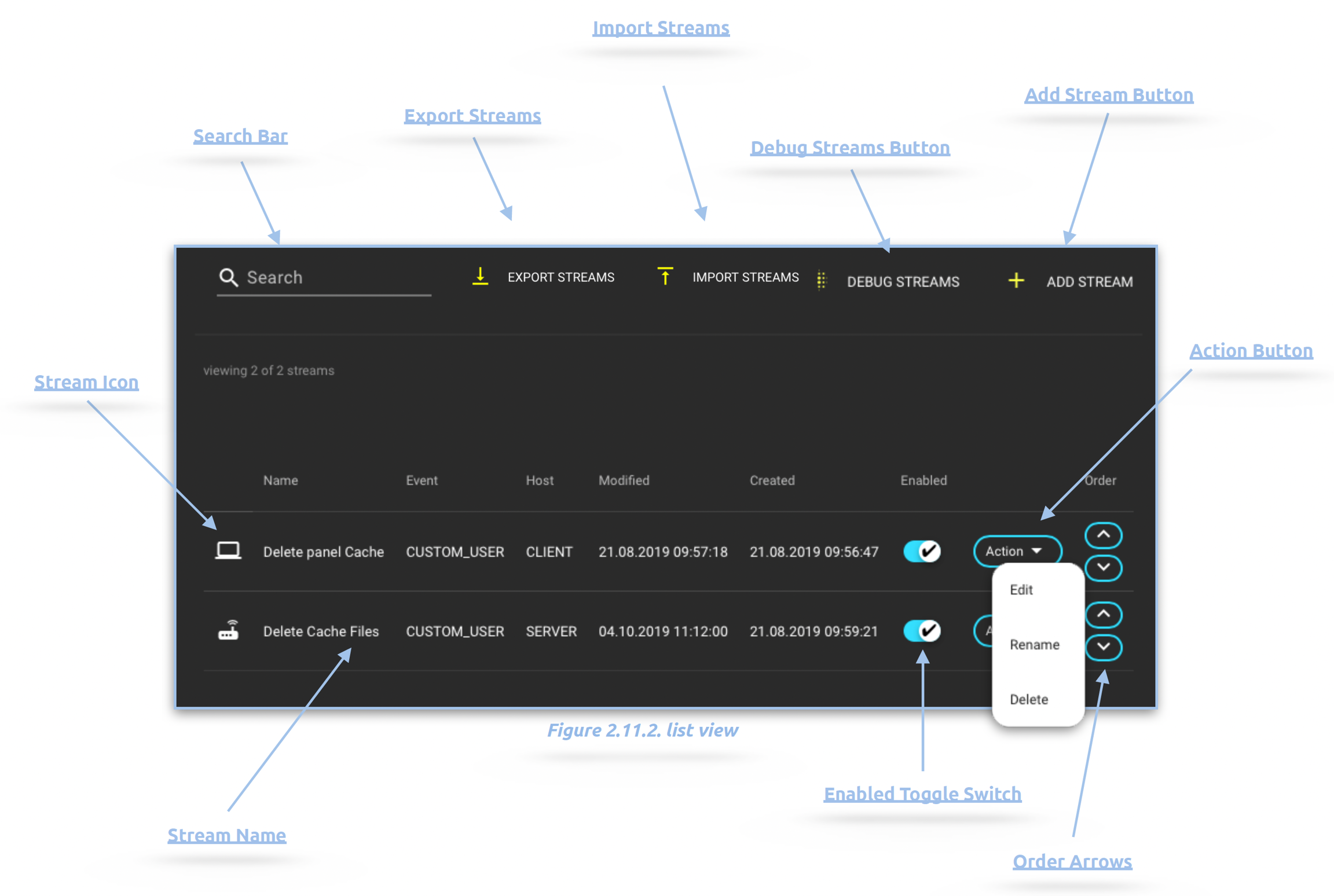 This view shows all trigger-related streams, including their names, host types, modification and creation dates, as well as the status of any stream(s).