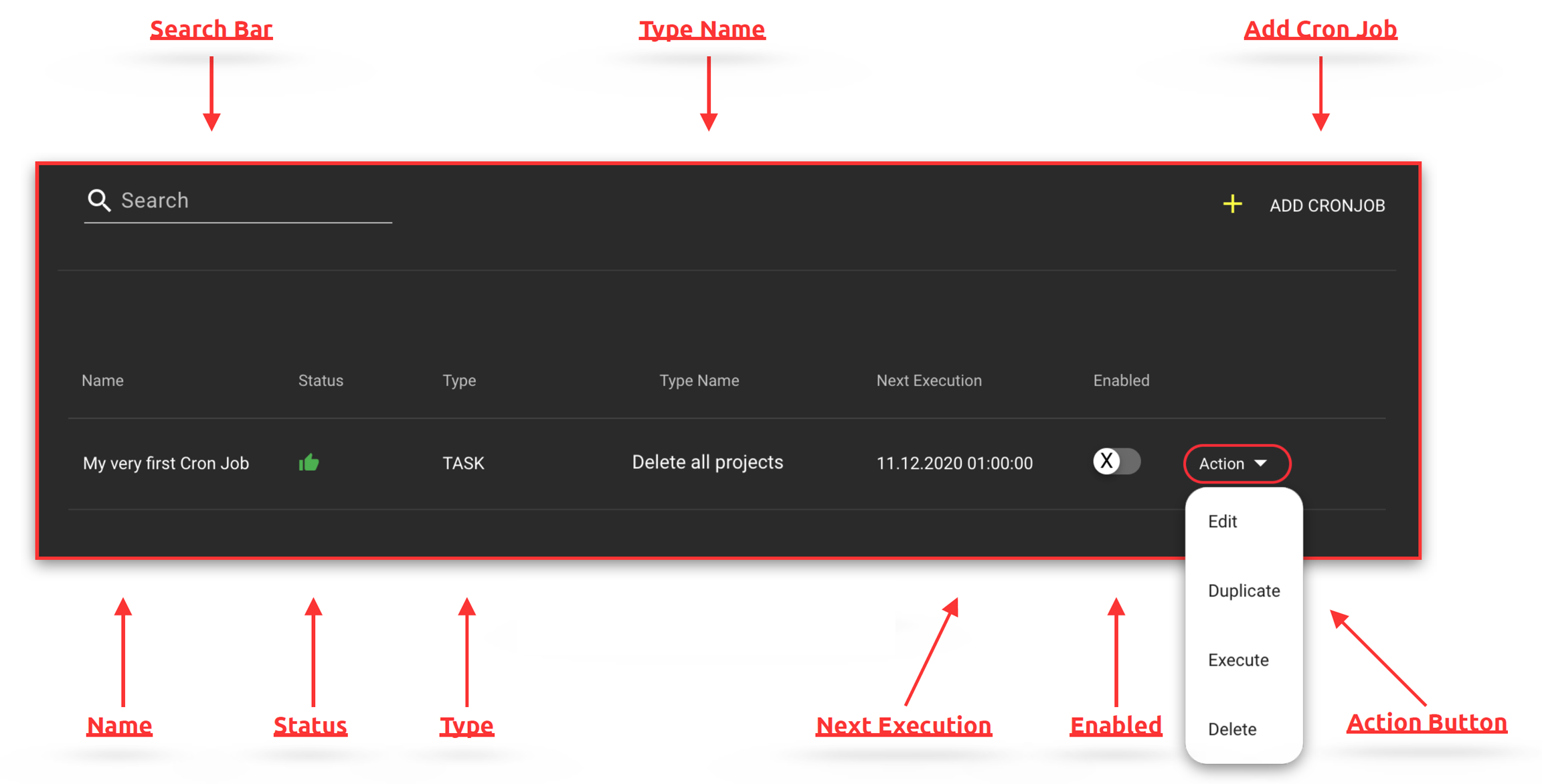 A cron job can be modified via the action button. It is possible to edit, duplicate, execute, or delete an entry. When an entry is edited, the same dialog opens as the "Add Cronjob" button.
