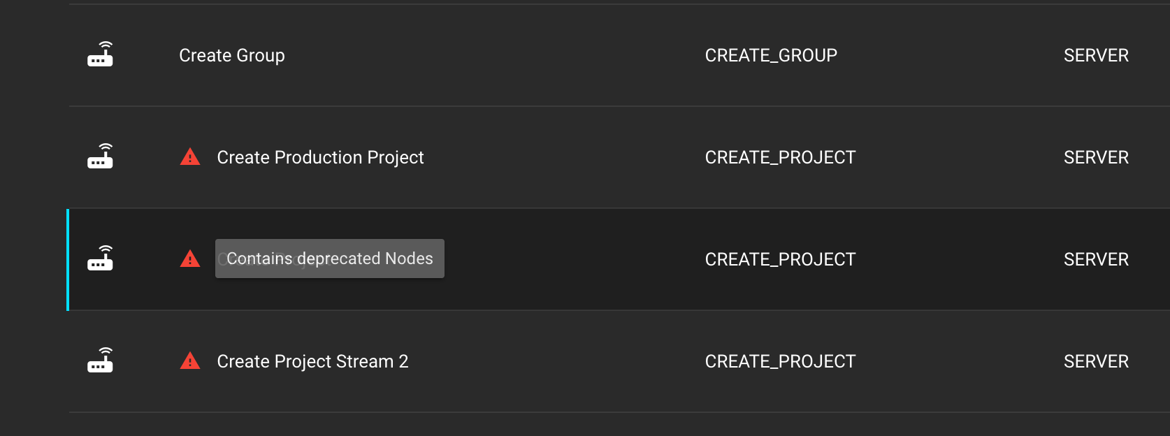The first indicator can be observed within the Streams tab. Any stream containing deprecated node(s) will display a red triangle with an exclamation mark, accompanied by the hover information 'Contains deprecated nodes'.