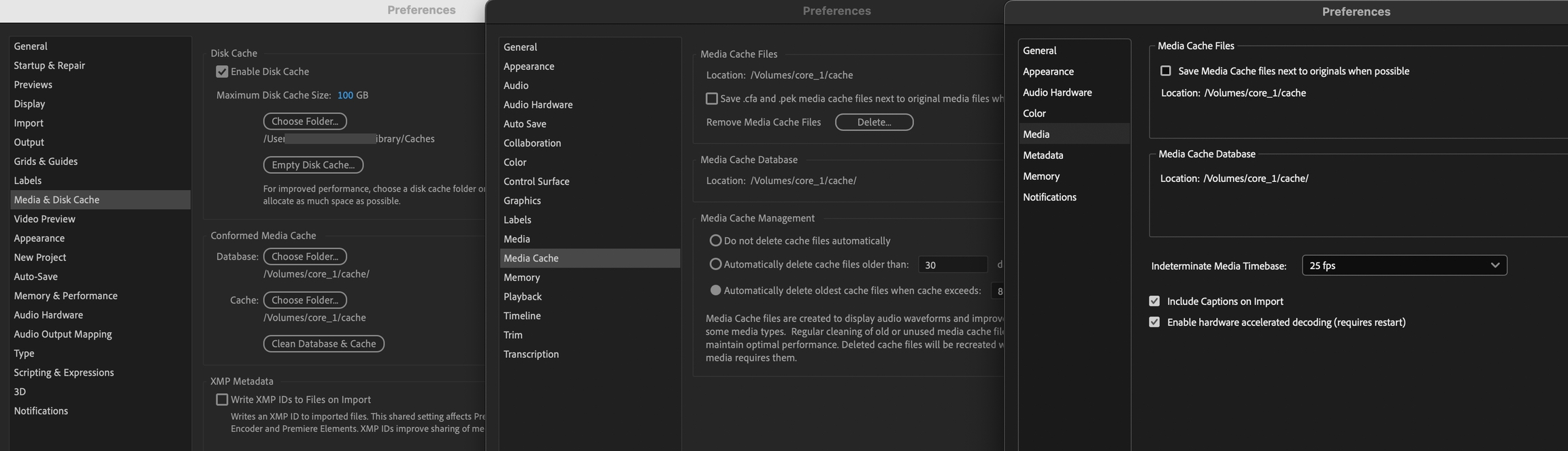 The cache settings apply to various Adobe applications, as shown in the screenshot below: After Effects on the left, Premiere Pro in the middle, and Media Encoder on the right.