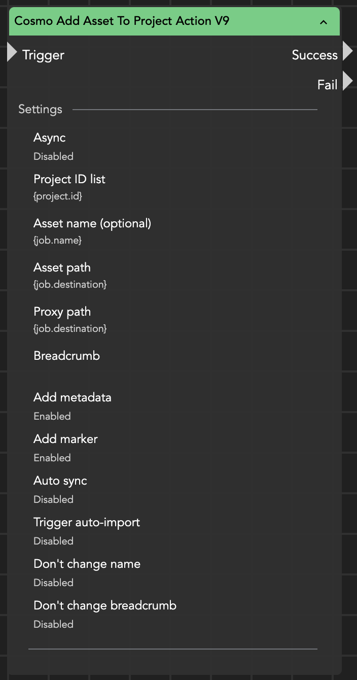 With the help of the Cosmo Add Asset to Project Action it is possible to add an asset to one or more projects that exist in Cosmo via a stream. For that the project ID’s of considered projects will be added to field ’Project ID List‘ in comma separated order. A distinction is made between asset path and asset name. The asset path is the actual storage path including name and file extension, the asset name is the name the asset should have in the database and thus in Cosmo, Premiere or After Effects. A breadcrumb can be specified within the node. It can also be filled via a wildcard {job.breadcrumb} depending on which trigger was used for the stream. In the case of an auto import or a web upload, this wildcard is available, but not in the case of an export or watch folder workflow. There is an option to keep the original asset name (check box) to ensure, for example, within an auto import that the assets are not renamed during synchronization via the panel. This enables the editors to rename the assets in premiere during an auto import process and to keep these names. The set names can be updated by re-indexing the project in the Cosmo database. There is an option to keep the original breadcrumb (check box) to ensure, for example, within an auto import that the assets are not moved during synchronization via the panel. This enables the editors to change the location of the assets in premiere during an auto import process and to keep these locations.