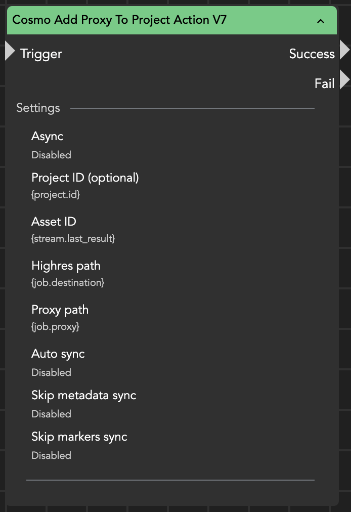 With the help of the Cosmo Add Proxy to Project Action it is possible to add or update a proxy to an existing HighRes asset in Cosmo. If the HighRes asset has not been added before the proxy has been added, the node will fail. There are three options of attaching that depending on the input parameters which the user provides. "Asset ID" has the highest priority and gives the option to attach a proxy to one individual asset. "Project ID" means that all assets with the same Highres Path inside the project will receive the proxy. Providing only the „Highres Path“ without the other two options forces all assets to be saved in the database that match with Highres Path to receive the proxy.