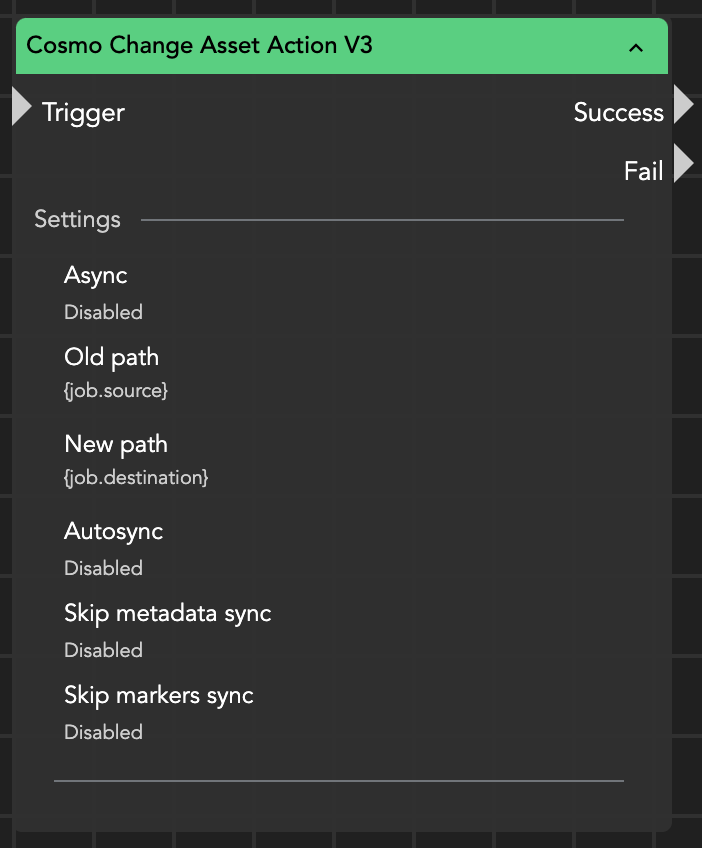 With the help of the Cosmo Change Asset Action it is possible to change the path of a file in Cosmo globally. For example, if a file is moved (archive) via a housekeeper workflow, the new storage location can be made known and, if the Autosync function is activated in the node, it can also be automatically reset in all premiere projects (after the project has been opened).