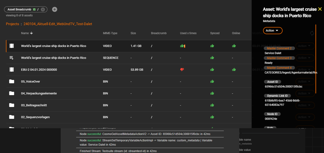 Consider an asset with the asset ID “6225d94587a52b082de53896”, the metadata key “type” and value “VIDEO”. To retrieve the value “VIDEO” a Cosmo Get Asset Metadata Action node must be added into the stream with 6225d94587a52b082de53896 as asset ID beforehand. The node ID e.g. “d7d99d44-07a1-40f8-8053-3db89482342c“ of this node can be used to get the metadata value “VIDEO” for its metadata key by using the {node.result.?} wildcard as following: {node.result.d7d99d44-07a1-40f8-8053-3db89482342c\_type}.