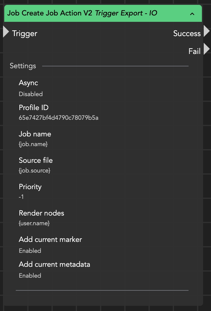With the help of the Job Create Job Action, it is possible to create a job via a stream instead of creating it via a regular route (auto import, web import, export, etc.). It is possible to use the profile ID, the job name, the Define priority as well as the rendering node(s) for which the job is intended. In addition, metadata and stream variables can be adopted from the stream that creates the job. The profile ID of a profile can be found in the hidden overlay of the respective profile. This node can be used for a variety of purposes.
