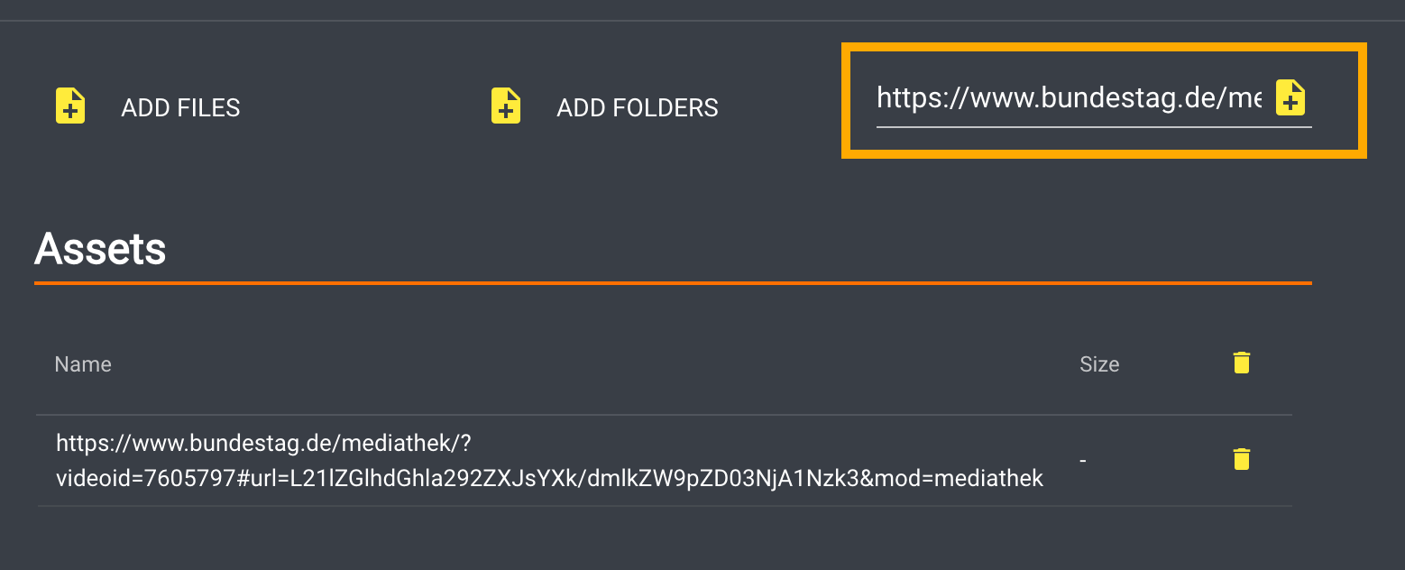 Configuring the node is straightforward. First, you need the IP address of the server host running the Web-Content-Downloader Stack, along with the exposed port (default port: 8010). Next, specify the URL from which the asset will be downloaded, such as "Bundestag - 148. Sitzung." Lastly, you can set a path for saving asset metadata in JSON format. The asset metadata path is optional; if not needed, leave it empty. Metadata will only be downloaded if the source provides sufficient information.
