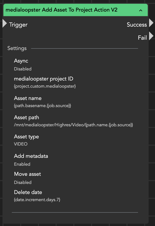 The medialoopster Add Asset To Project Action adds an asset to a project within medialoopster.