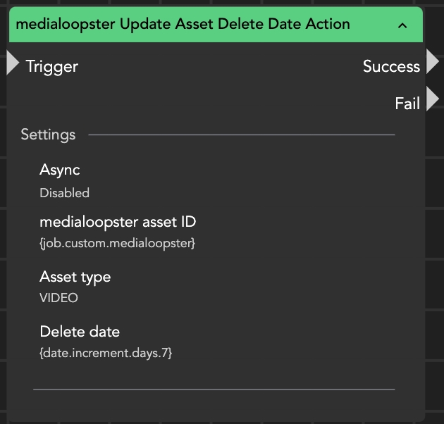 To update the asset, you must provide the medialoopster asset ID—ideally retrieved using the wildcard {job.custom.medialoopster} —as well as the new deletion date and the asset's MIME type.
