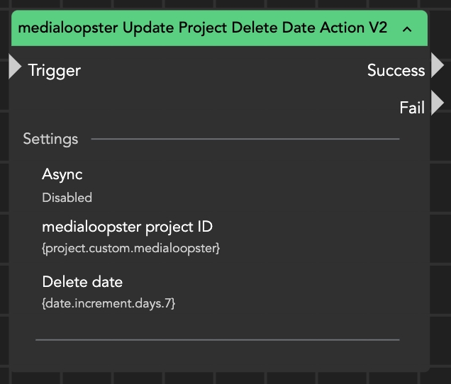To update the project/collection, you must provide the medialoopster project/collection ID—ideally retrieved using the wildcard {project.custom.medialoopster}—as well as the new deletion date.