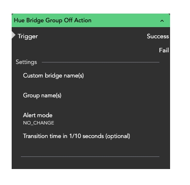 With the help of the Hue Bridge Group Off Action it is possible to switch off one or more groups in the Hue System. It is possible to switch off one or more groups. The transition time can be set in seconds from 1 to 10 and, if necessary, the lamps can be made to flash via the alert mode before they are switched off.