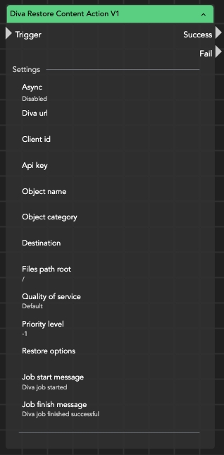 By using the Diva Restore Content Action node within a stream it is possible to trigger a restore object job in Diva. This node is using SOAP.