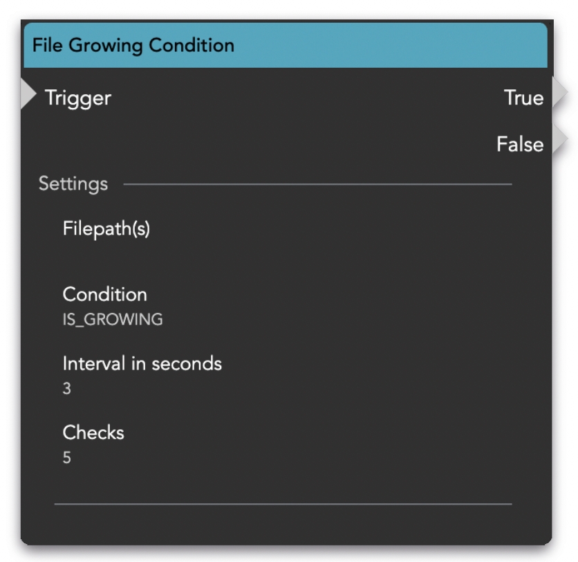 With the help of the File Growing Condition it is possible to use the fact whether a file is still in the write state or not as a condition for further actions. The path and the extension of the file are specified here. You enter the interval within which the node checks the file and the number of checks itself. For example, if 3 seconds are specified as the interval, 5 checks are defined and the condition is set to "is_growing", the following happens: