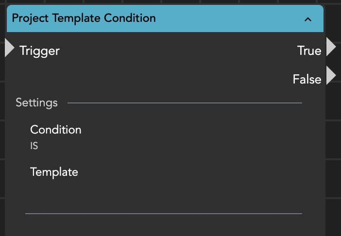 With this conditional node, it is possible to check the assigned template of a project. If the project's template matches the string input set within the condition, the node will exit either with a true or false outcome.