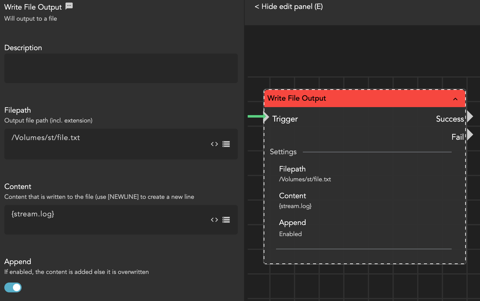 For instance, to write the stream log into a text file, you would input the path, including the filename and extension, into the node and utilize the wildcard {stream.log} as input parameters. An example path could be /Volumes/folder/folder/mytextfile.txt.