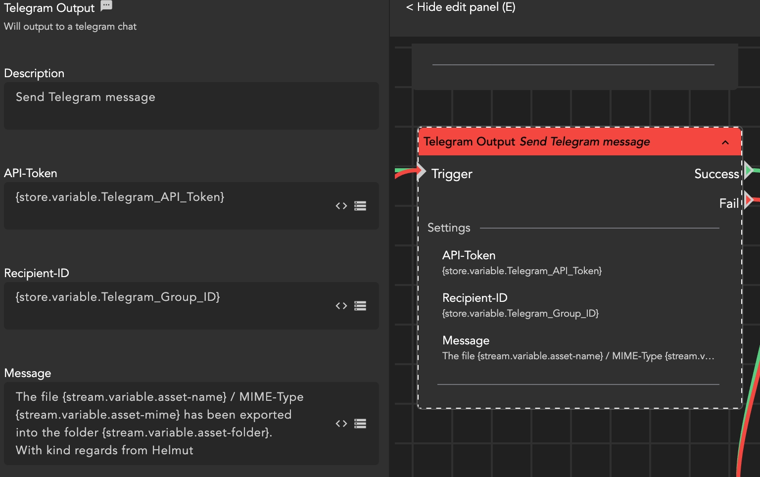 To facilitate easier management of the API-Token and recipient-ID, these can be stored in variable storage. This enables seamless modification or variation of the group, such as incorporating the group name into the combination.